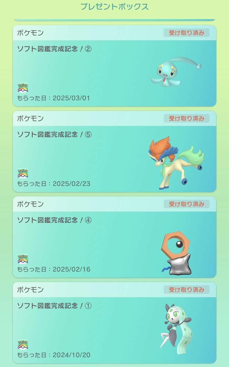 「カントー図鑑」の色違いメルタン、「シンオウ図鑑」の色違いマナフィ、「ガラル・ヨロイ・カンムリ図鑑」の色違いケルディオ、「パルデア図鑑」の色違いメロエッタ。